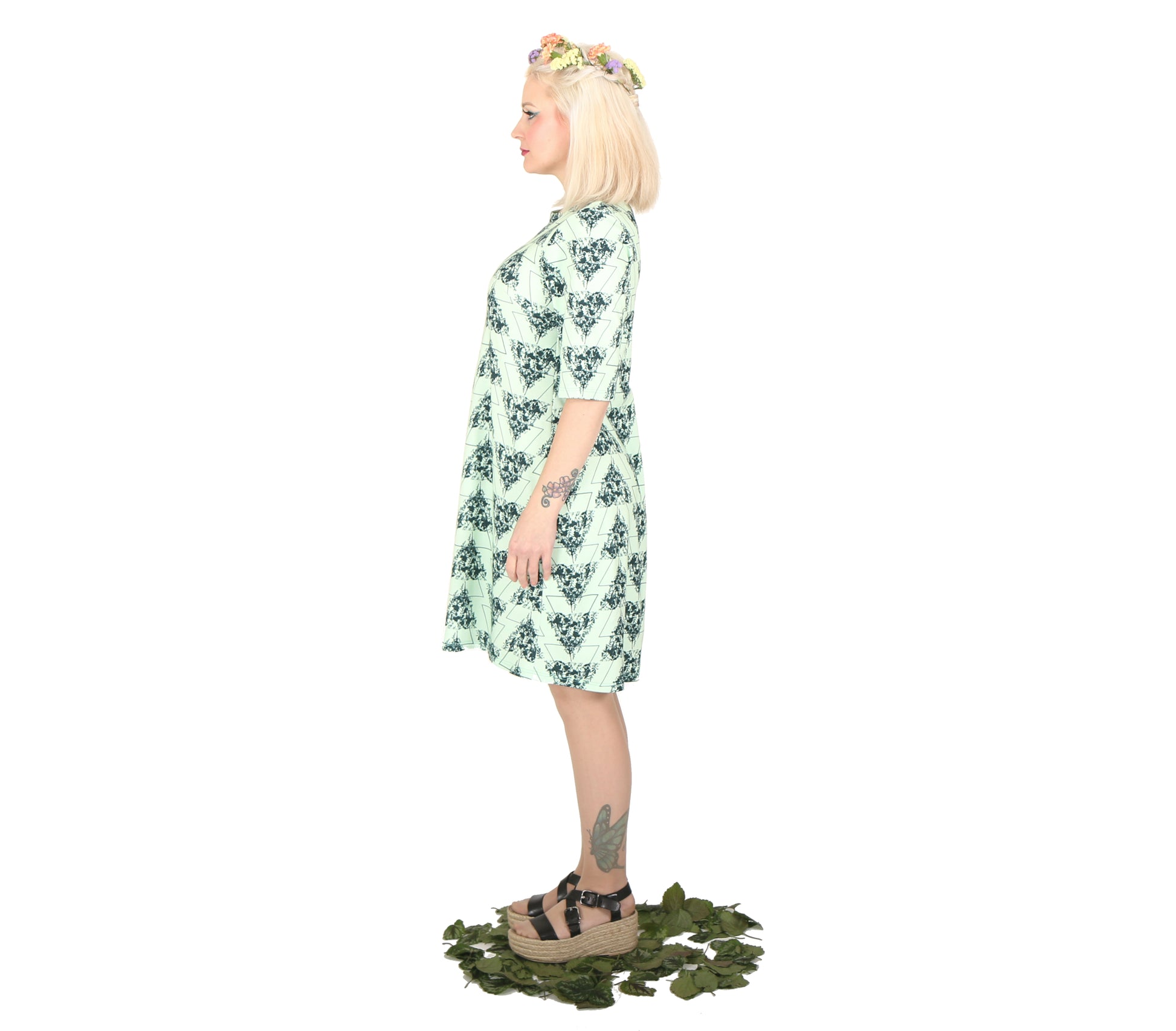 Lovely knee length a-line summer dress made of Finnish made 100% organic cotton jersey. Dress has comfortable loose cut, darts on bust and volume giving dart on the back. Neckline is V shaped in the back. Pattern is Vietto’s own print called “Wildflowers”, it’s inspired by summery wildflower meadows and geometry.