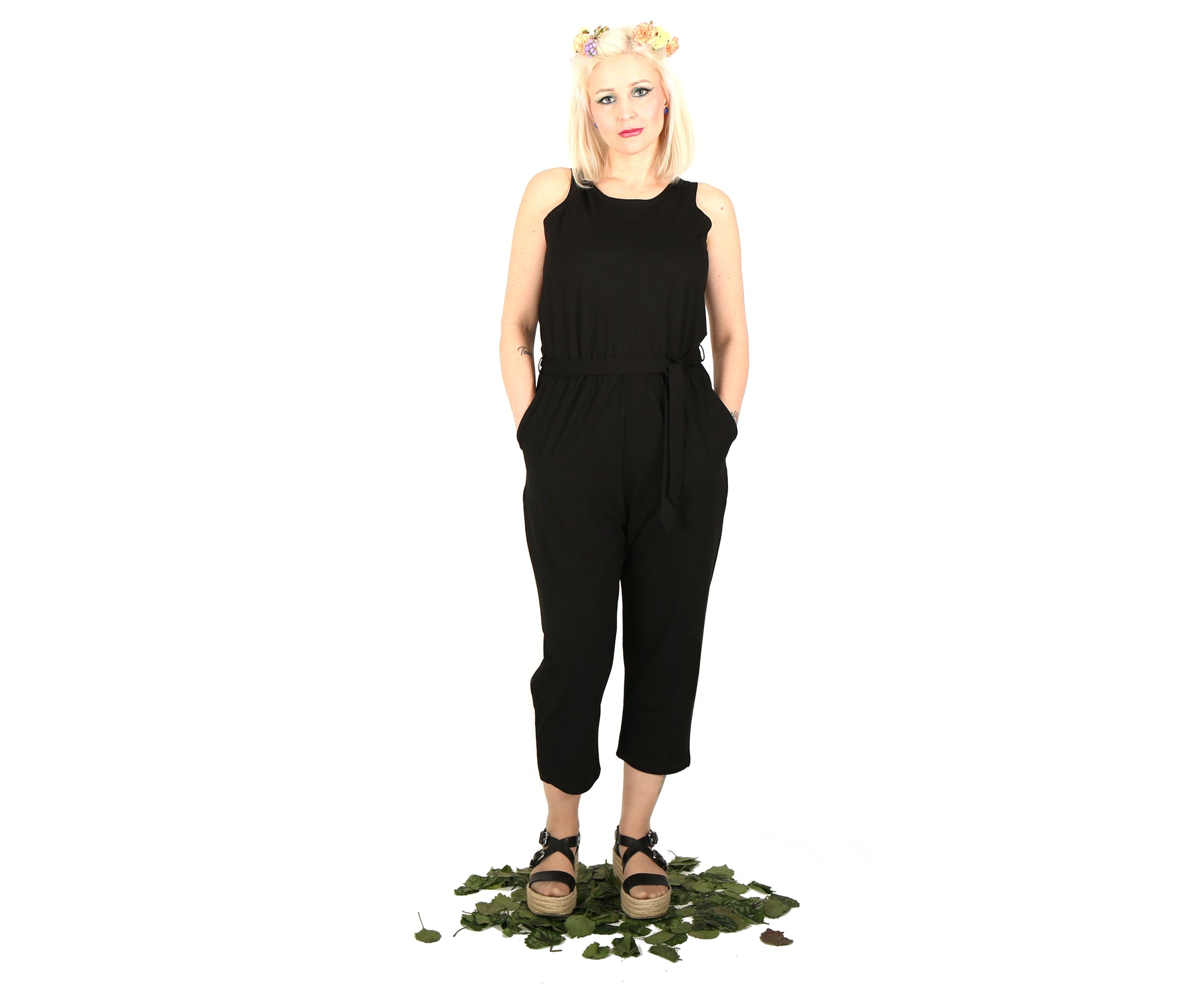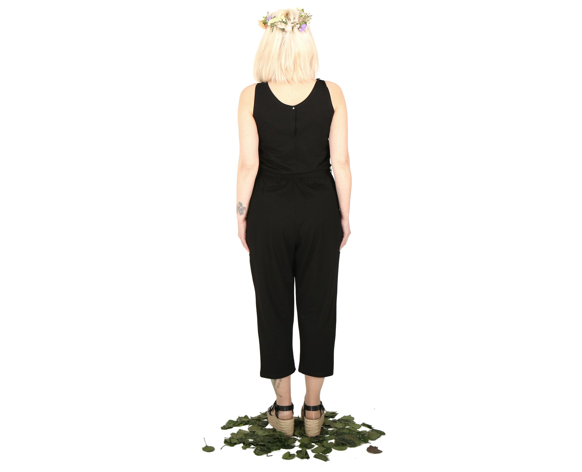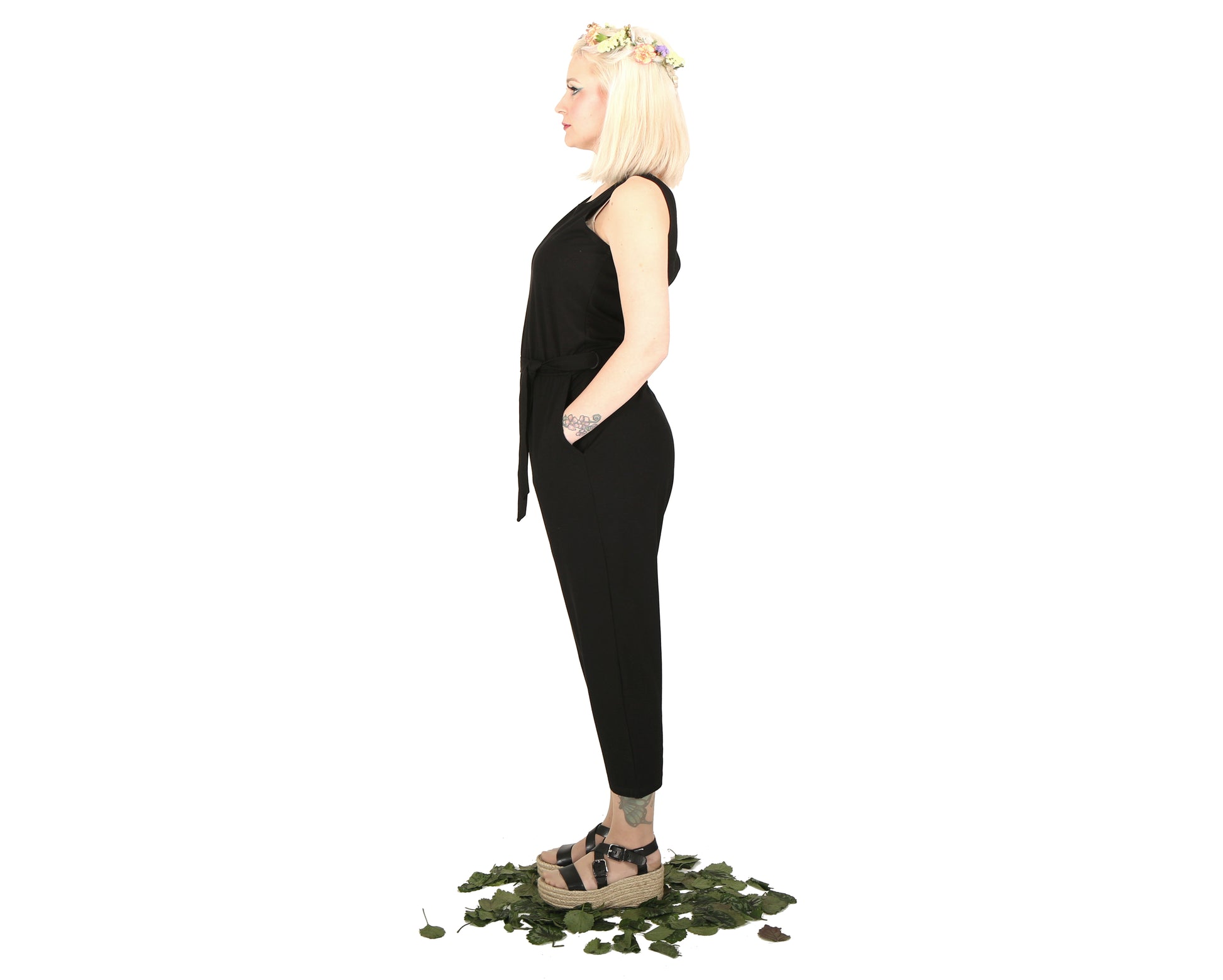 Vietto musta bambuinen haalari on todella mukava haalari Suomessa neulotusta bambu-lycra -neuloksesta. Materiaali on hyvin laskeutuvaa ja ihanan tuntoista päällä. Hihaton malli, jossa vajaamittaiset lahkeet. Leikkaus on rento mutta tyylikäs, haalari sopii yhtä hyvin tennareiden, sandaalien tai korkokenkien kanssa. Kuminauhavyötärö, solmiamisvyö ja taskut sivussa. Takana niskassa yksi neppari, haalari on helppo pukea ja riisua. Näyttää kivalta myös t-paidan kanssa.
