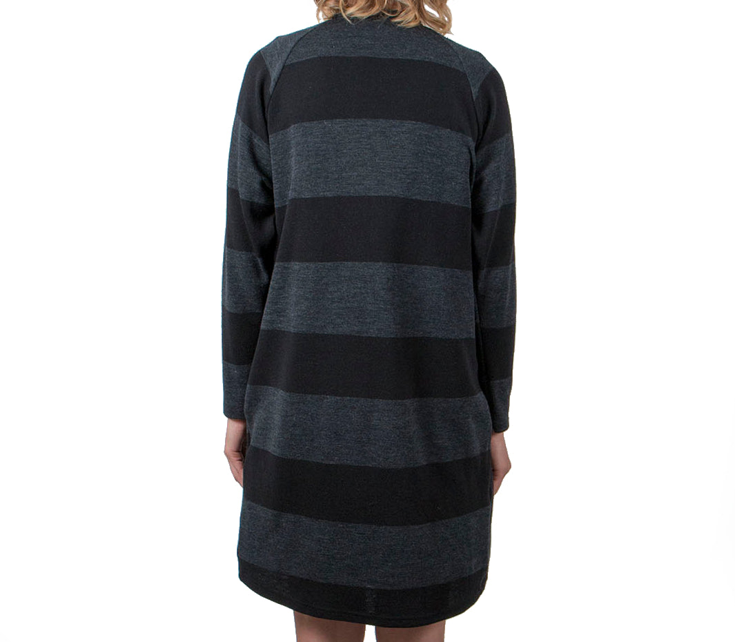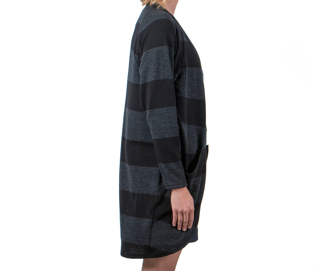 Pehmoinen ja erittäin lämmin villainen neuletakki Suomessa neulotusta 100% merinovillaneuloksesta. Takissa on rento leikkaus ja edessä isot taskut. Reilut etukappaleet voi kietoa ympärille ja laittaa esim vyöllä kiinni. Materiaali on joustavaa, eikä kutita. Raidallinen neulos on yksiväristä neulosta paksumpaa jaquardneulosta.