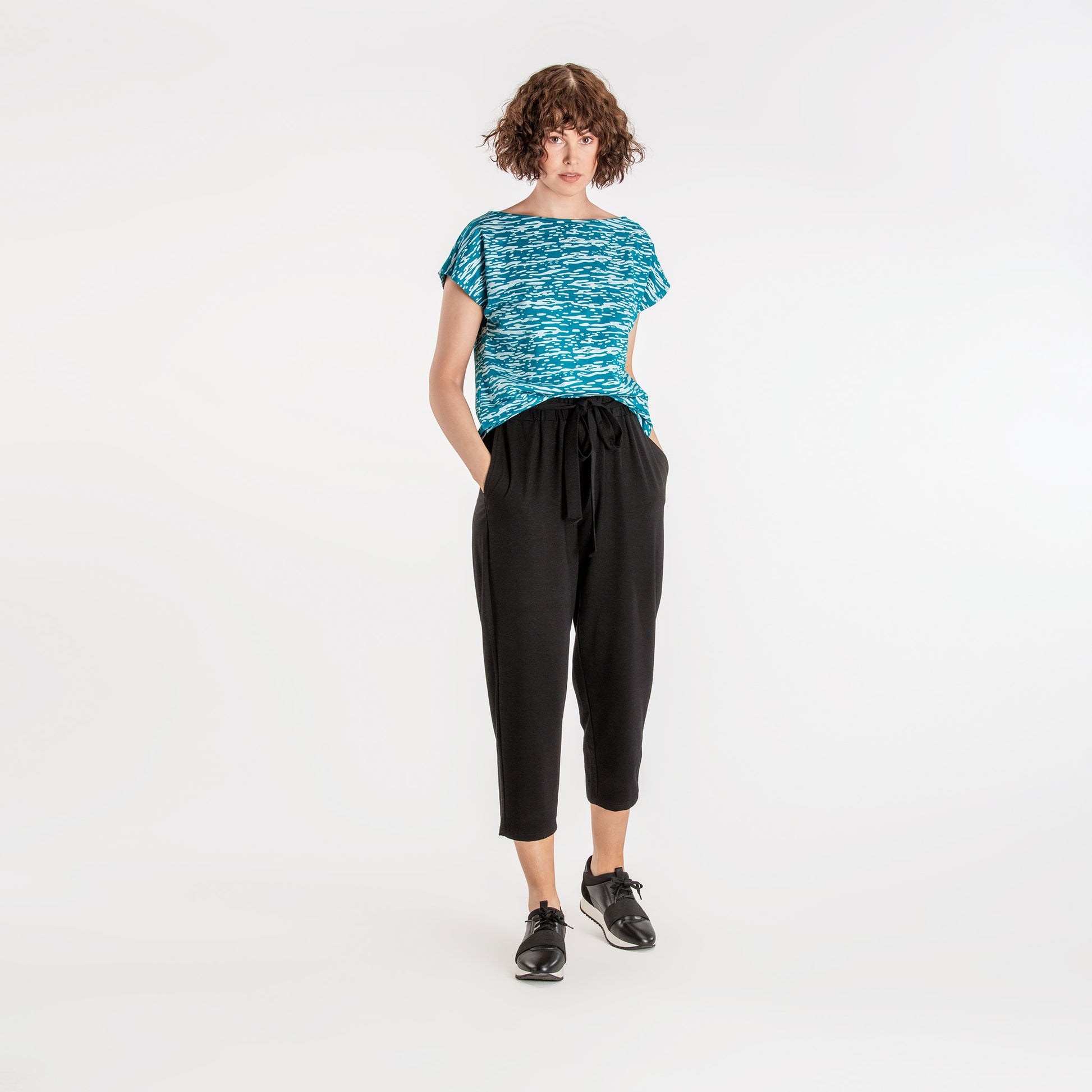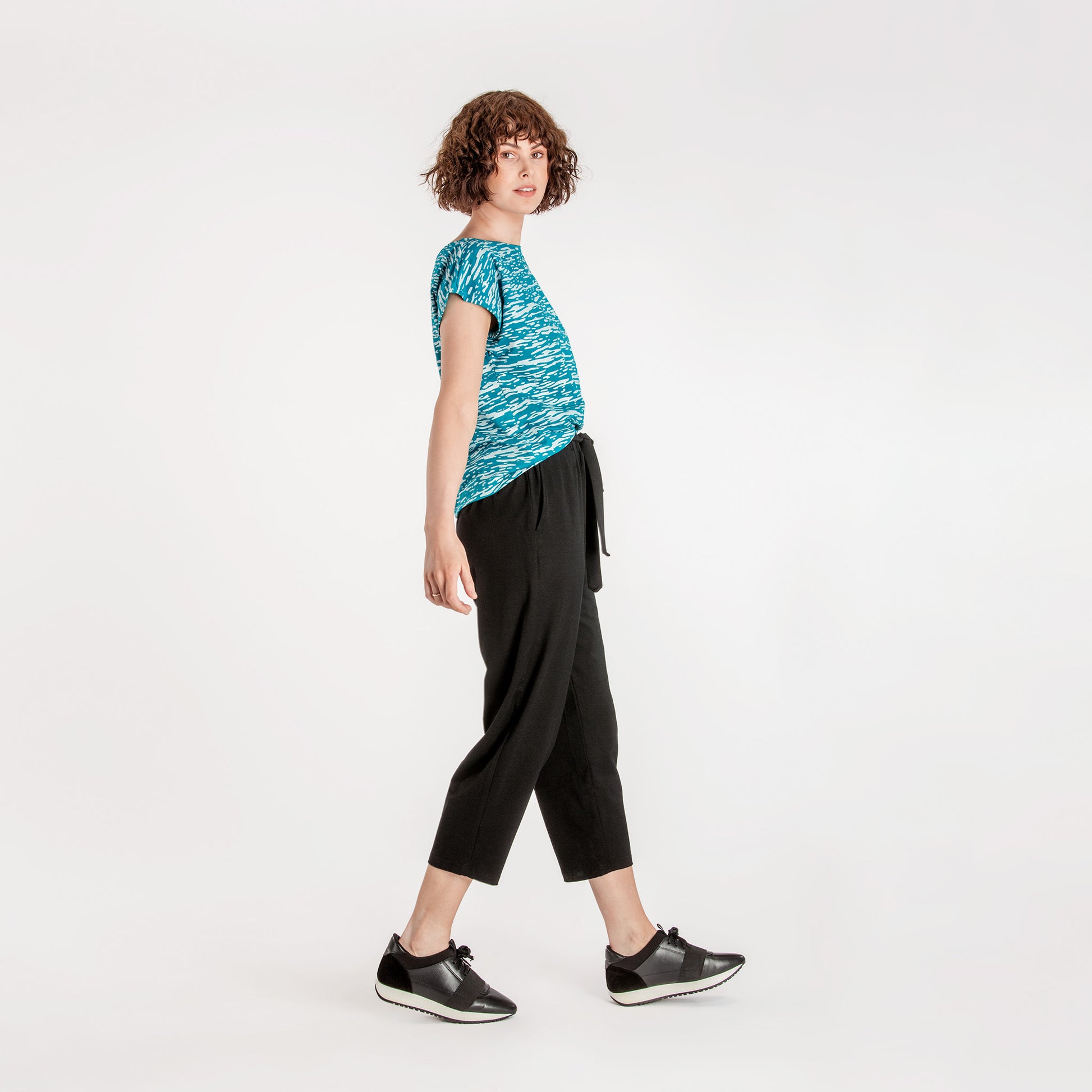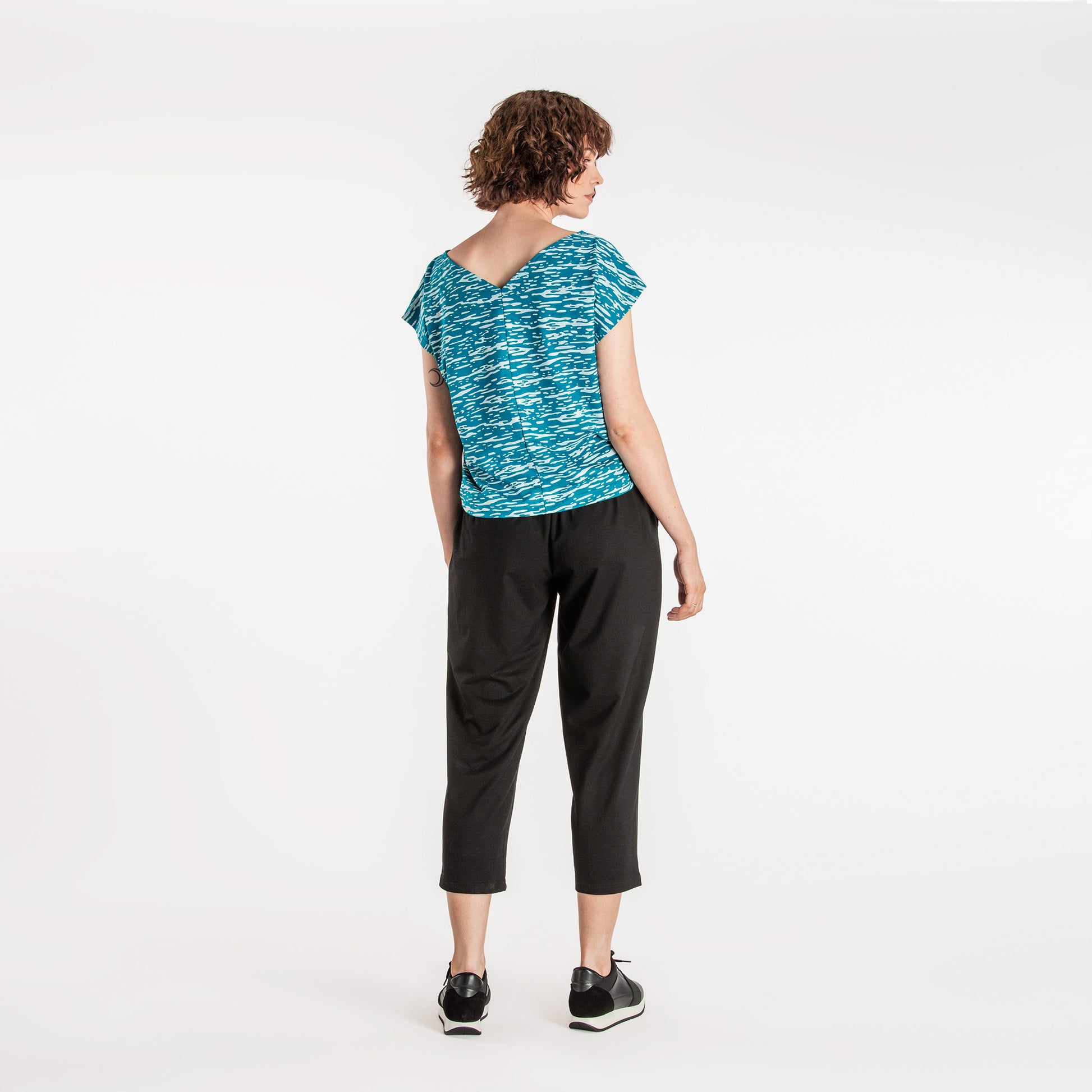 Vietto Liplatus v-selkätoppi on väljä, todella mukava holkkihihainen t-paita/toppi. Edessä topissa on venepääntie, takana se avautuu kauniisti v:n muotoiseksi. Paitaa voi käyttää myös toisin päin, v-pääntie edessä. Kankaassa on Vieton Liplatus-kuosi, joka on saanut ideansa vedenpinnan väreilystä. Petroolin pohjan päällä on vaaleaa, vähän kimaltavaa aaltokuviota.
