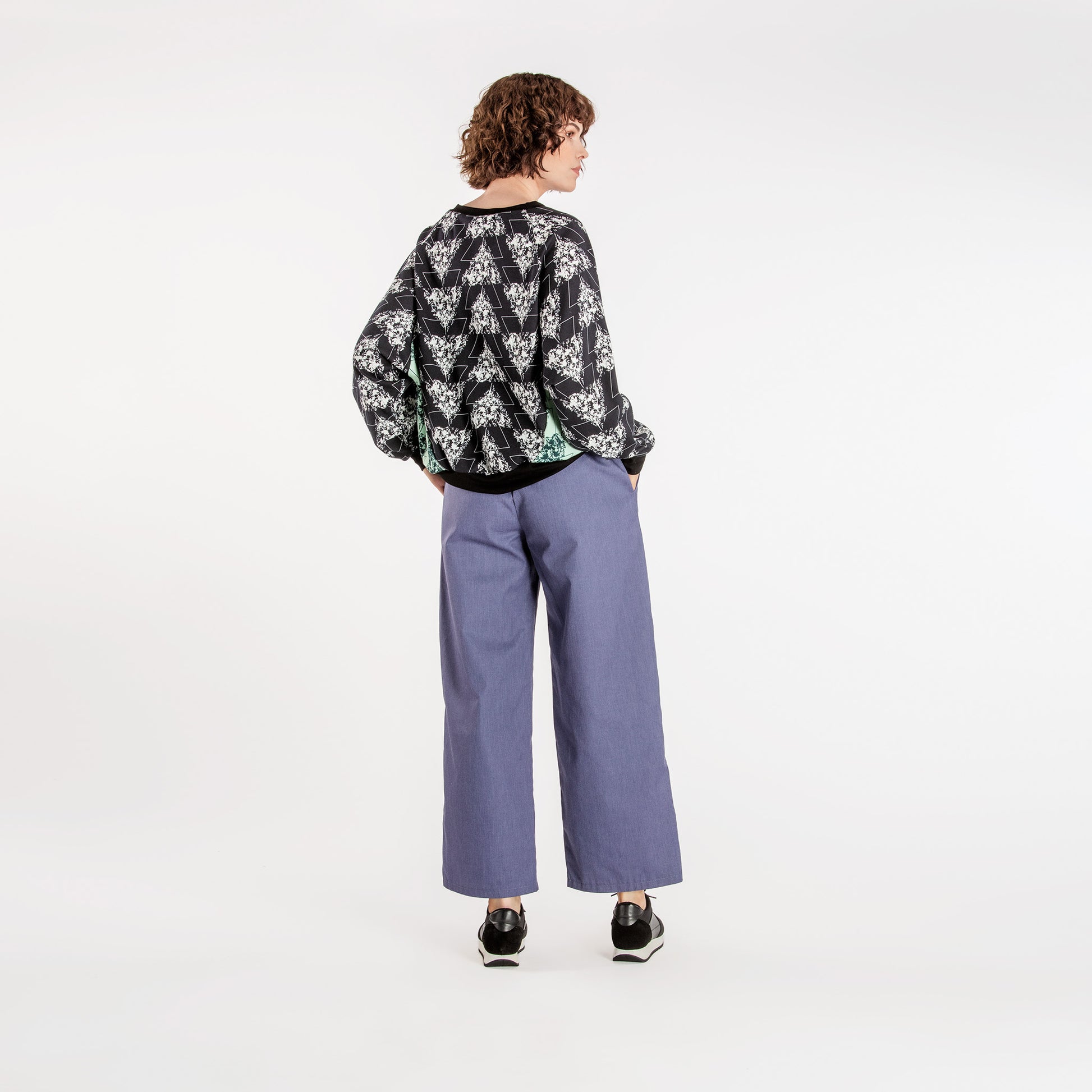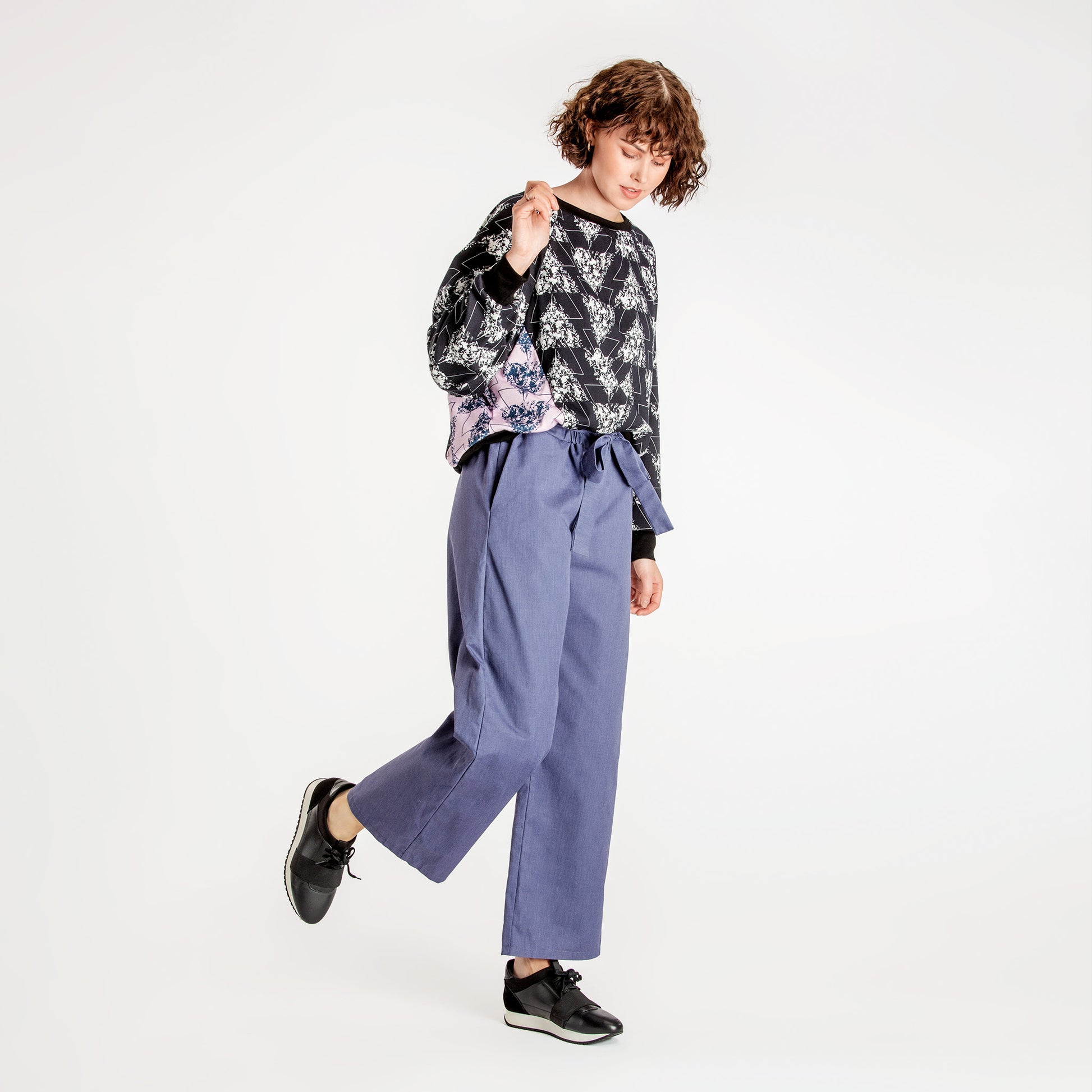 Materiaali: 65% polyesteri 35% puuvilla tekstiiliteollisuuden ylijäämää. Housut ommeltu Ompelimo M. Suvisella Helsingissä, Suomessa.