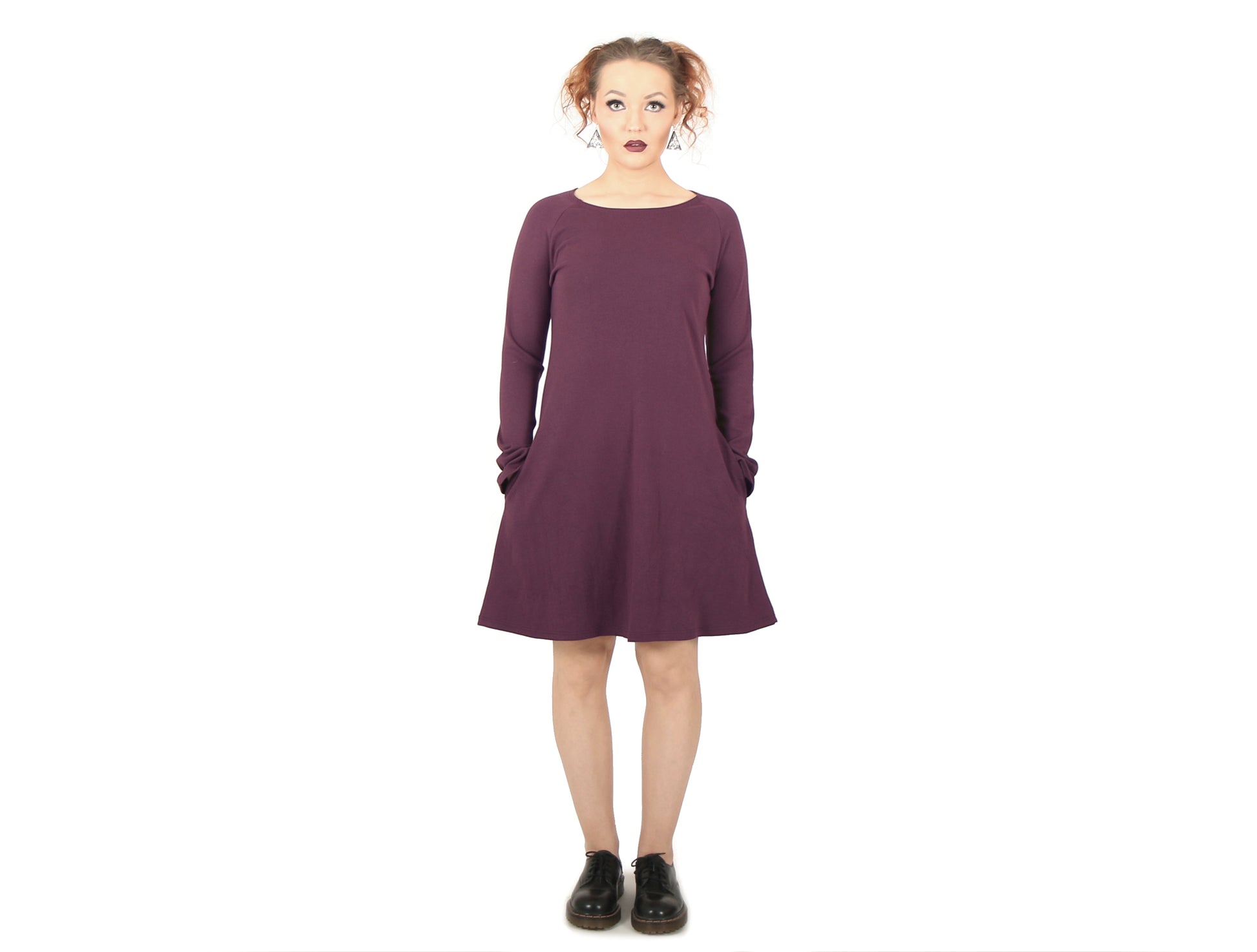 Lovely dress made of Finnish made 100% organic cotton. Dress has a flattering a-line hem, slightly bell shaped sleeves and o-neckline. Soft and lovely dress for cooler season! Three sizes and four colours: black and white Wildflowers pattern, black, plum and olive green.
