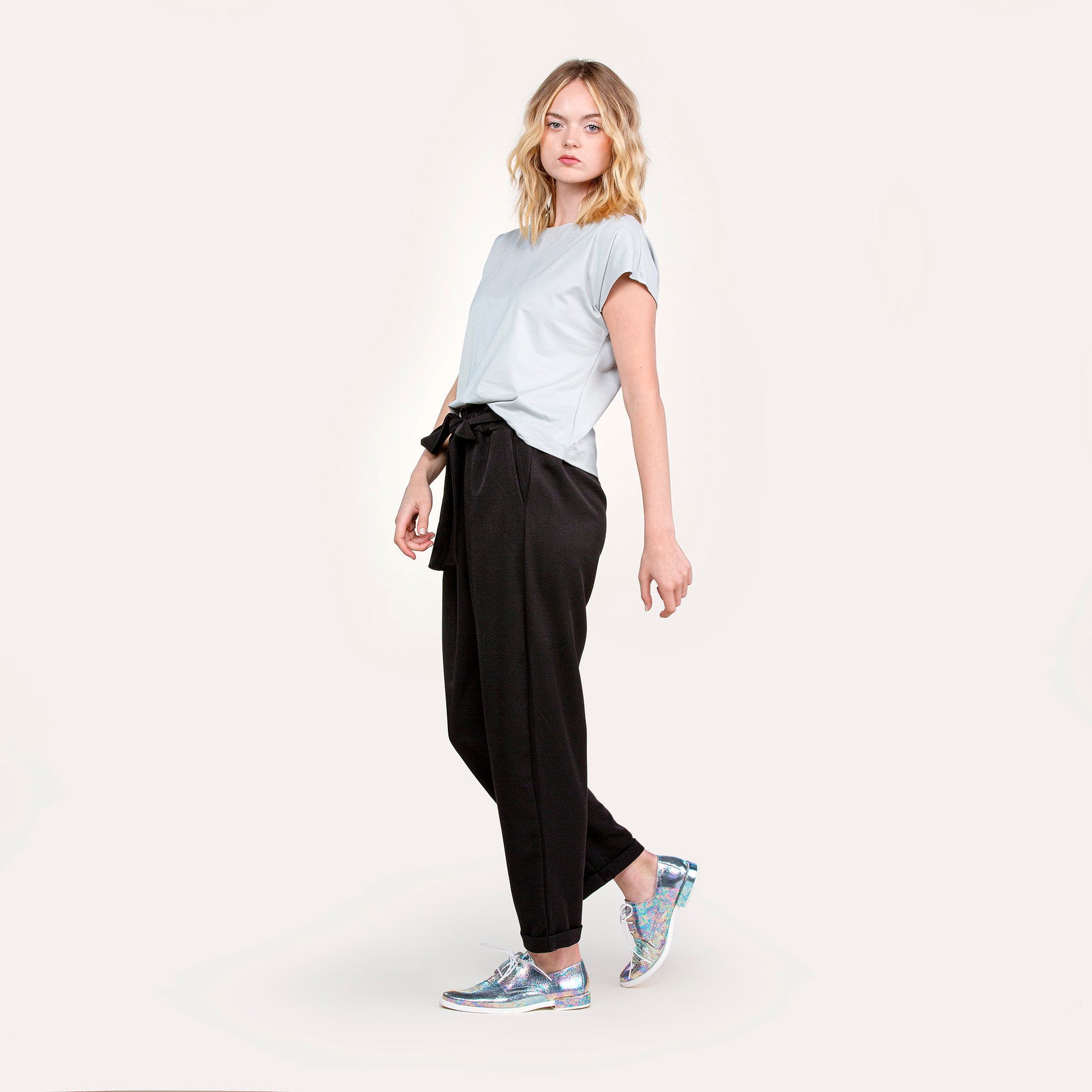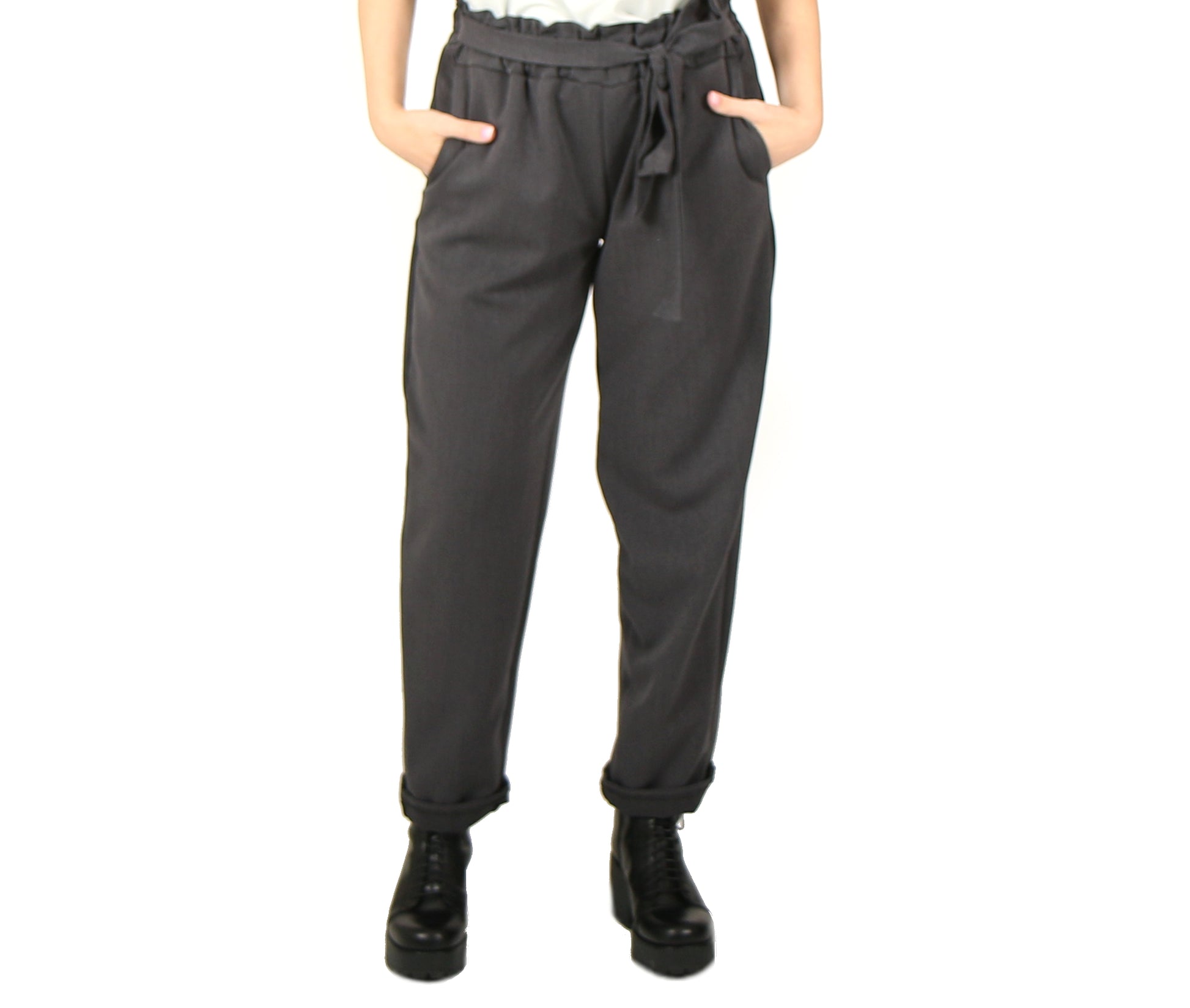 Vietto löysät paper bag housut ovat tyylikkäät ja mukavat housut vaikkapa toimistoon. Housuissa on joustava vyötärö ja sivusaumoissa solmittava vyö. Sivutaskut ja hiukan vajaamittaiset lahkeet kapeilla upslaakeilla. Leikkaus on väljähkö lantiolta, lahkeet kapenevat lahkeen suuhun.