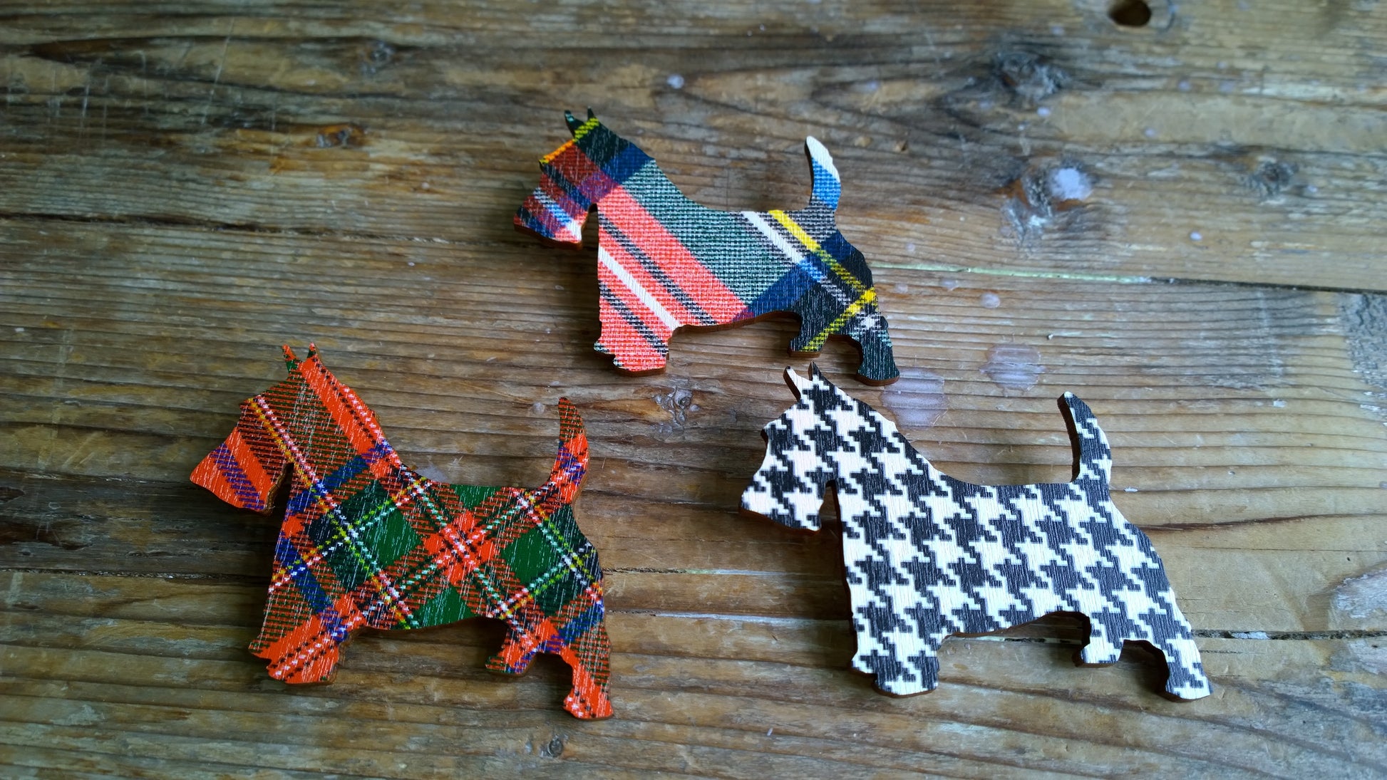 Vietto Skottikoira rintaneula on hauska puinen rintaneula, joka on valmistettu laserleikkaamalla muoto suomalaisesta koivuvanerista ja printtaamalla sen pintaan ruutu- tai kukonaskelkuosi. Rintaneulassa on lukollinen neulakiinnitys. Koko 8cm x 6cm.