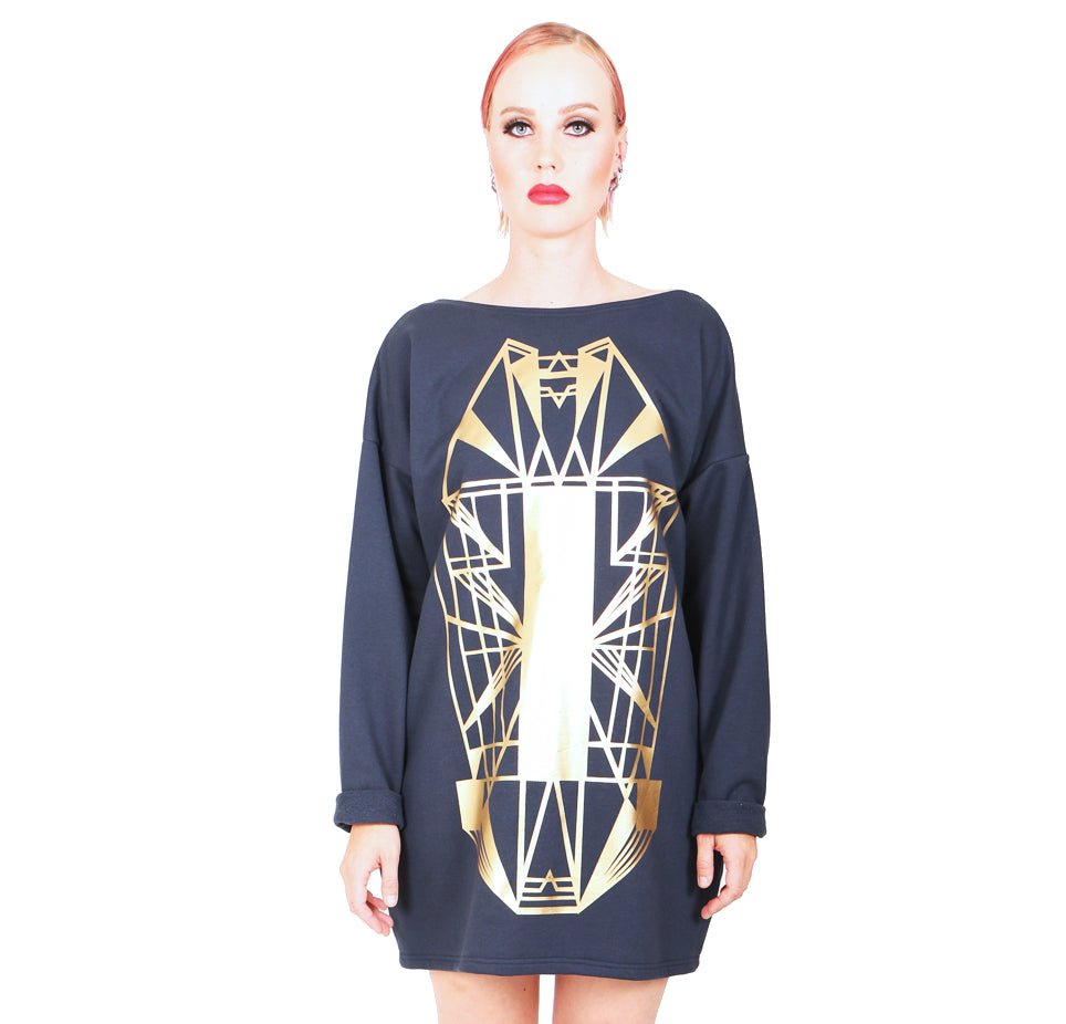 Rento mekko Suomessa valmistetusta paksusta collegeneuloksesta, joka on suomalaisen tekstiiliteollisuuden ylijäämämateriaalia. Mukava, pitkähihainen malli jossa sivusaumoissa taskut. Edessä iso printti, joka on saanut inspiraationsa Art Decosta. Printti on tehty kalvotekniikalla joka mahdollistaa värikylläiset värit. Hihat ovat ylipitkät ja ne näyttävät kivalta käärittyinä. Pääntie on takana v:n muotoinen.