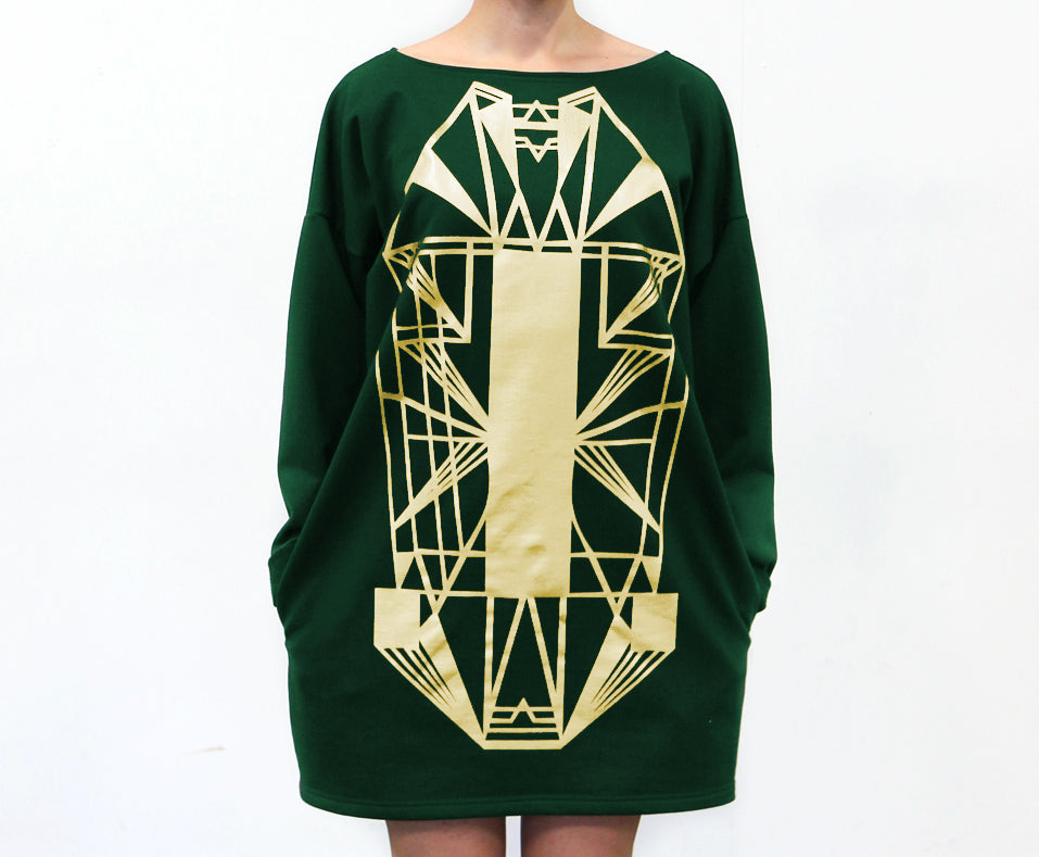 Rento mekko Suomessa valmistetusta paksusta collegeneuloksesta, joka on suomalaisen tekstiiliteollisuuden ylijäämämateriaalia. Mukava, pitkähihainen malli jossa sivusaumoissa taskut. Edessä iso printti, joka on saanut inspiraationsa Art Decosta. Printti on tehty kalvotekniikalla joka mahdollistaa värikylläiset värit. Hihat ovat ylipitkät ja ne näyttävät kivalta käärittyinä. Pääntie on takana v:n muotoinen.